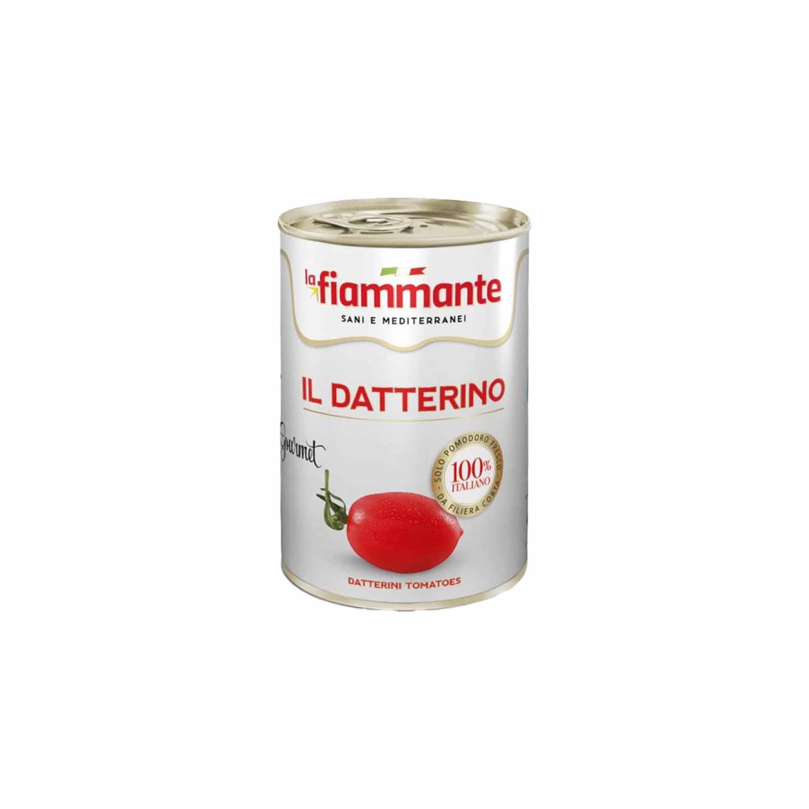 Blik met Datterini tomaten van het merk La Fiammante. Deze tomaten zijn geschikt voor het maken van pizza- en pastasaus. Datterini tomaten zijn kleine, langwerpige Italiaanse tomaatjes, afkomstig uit Sicilië, die bekend staan om hun zachte, zoete, volle smaak en vlezige textuur. Ze zijn vernoemd naar de dadel (‘dattero’) vanwege hun zoetheid en vorm. Deze tomaten zijn perfect voor sauzen, zoals pizza of pasta saus, maar ook lekker bij visgerechten.