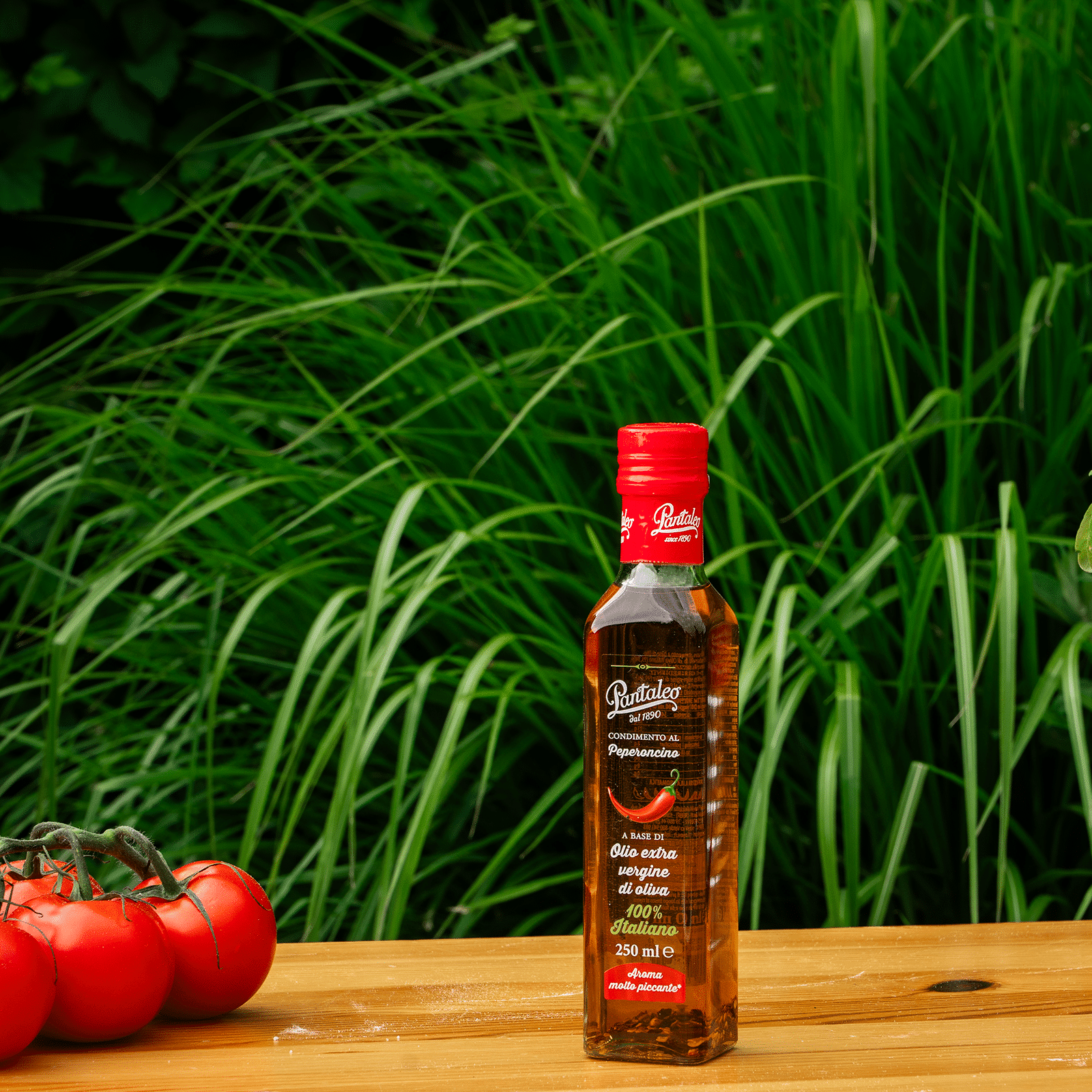 Extra vergine olijfolie met chilipeper van het merk Pantaleo.