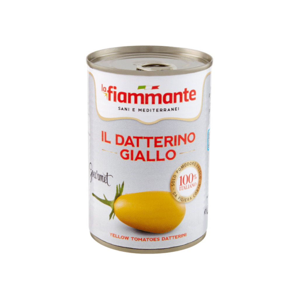 Blik met gele Datterini tomaten van het merk La Fiammante. Deze tomaten zijn geschikt voor het maken van pizza- en pastasaus.