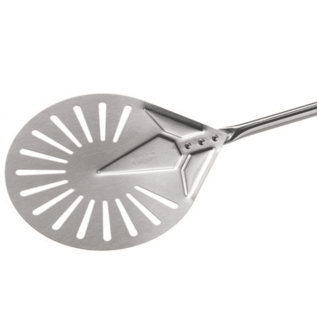 Geperforeerde draaischep, uit de lijn Azzurra van het merk Gi Metal. Dit product is ontworpen om pizza’s in een pizzaoven te draaien, zodat de warmte gelijktijdig over de pizza wordt verdeeld en de pizza gelijkmatig bakt. De perforaties laat overtollige bloem wegvallen voor een perfect gegaarde pizzabodem. Het handvat en schuifgreep zijn gemaakt van een specifiek polymeer met hoge dichtheid voor extra hittebestendigheid. De schuifgreep zorgt ervoor dat je de steel overal goed kan ondersteunen zonder dat je je handen brandt als de steel heet is. Combineer deze draaischep met andere producten van Gi Metal!