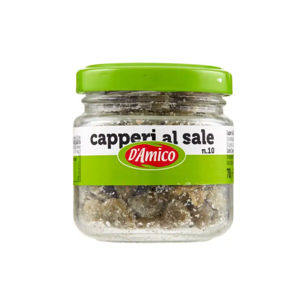 Kappertjes in zout (formaat 10), van het merk D’Amico. Deze kappertjes zijn geschikt als topping op pizza’s, in een pasta of een salades. Dit product heeft een inhoud van 70 gram. Na opening in de koelkast bewaren. Dit product is beperkt houdbaar.