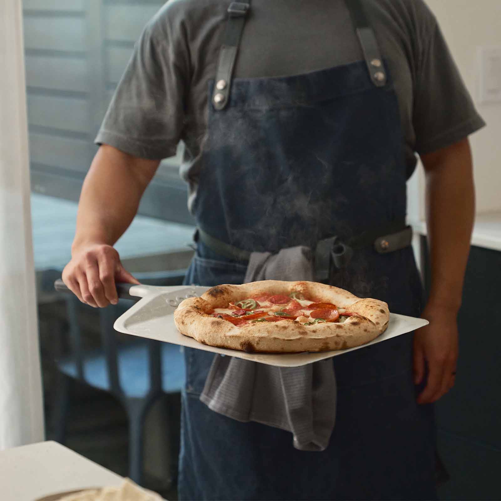 Het gladde, geanodiseerde aluminium oppervlak met non-stick eigenschappen maakt het scheppen en draaien van pizza’s eenvoudig – zelfs in een krappe ovenruimte. De afgeschuinde rand zorgt ervoor dat je de schep moeiteloos onder het deeg laat glijden. Zo werk je snel, gecontroleerd en zonder plakkend deeg.