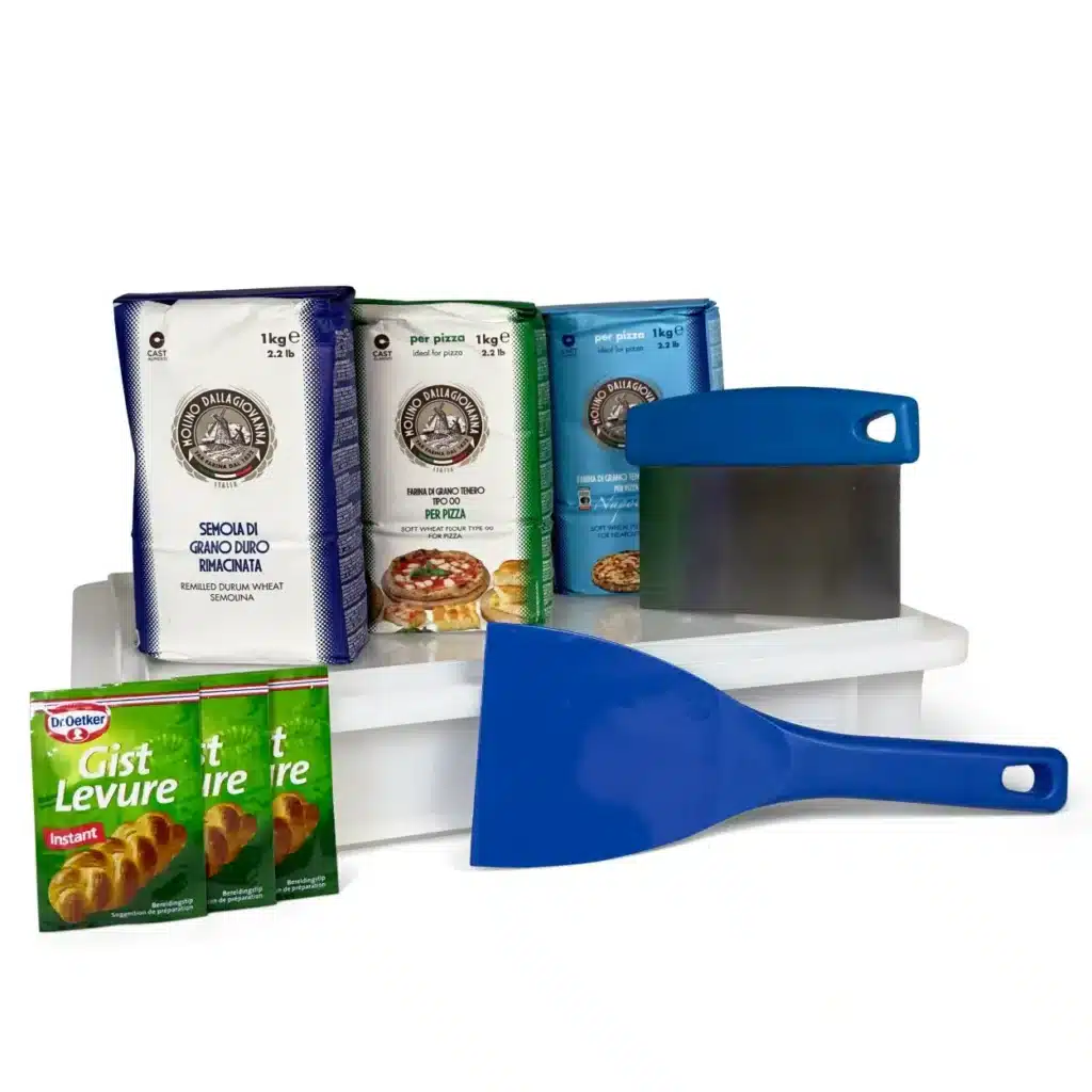 De naam verklapt het al een beetje, maar dit pakket is ideaal voor starters. Dit pakket heeft alles om uit te voeten te komen als je wil gaan starten met het bakken van pizza’s. Een pakket met 2 soorten pizzabloem, semola, gist, een deegbak met deksel, deegsteker en een flexibele deegspatel.